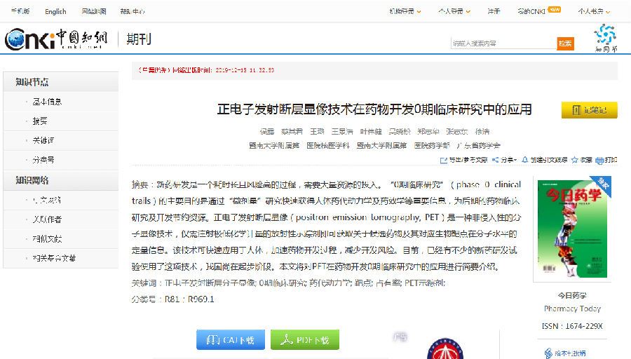 近日,暨南大學(xué)附屬第一醫(yī)院核醫(yī)學(xué)科聯(lián)合藥學(xué)部、廣東省藥學(xué)會(huì),在《今日藥學(xué)》發(fā)表綜述性論文“正電子發(fā)射斷層顯像技術(shù)在藥物開發(fā)0期臨床研究中的應(yīng)用”,根據(jù)國(guó)際藥物開發(fā)模式,在國(guó)內(nèi)首次正式提出利用PET分子影像進(jìn)行藥物開發(fā)0期臨床研究的概念。核醫(yī)學(xué)科徐浩教授為通訊作者,研究生侯露同學(xué)為第一作者。回旋加速器PET藥物中心王...