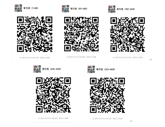 1-80號加入微信群“審方班(1-80)”,81-160號加入微信群“審方班(81-160)”,161-240號加入微信群“審方班(161-240)”,241-320號加入微信群“審方班(241-320)”,321-382號加入微信群“審方班(321-400)”。進(jìn)群截止時間:9月25日周三20:00前,培訓(xùn)相關(guān)事宜會在群上通知,入群后更改群昵稱為“編號 姓名 工作單位”,歡迎加入全國審方班大家庭?。?!