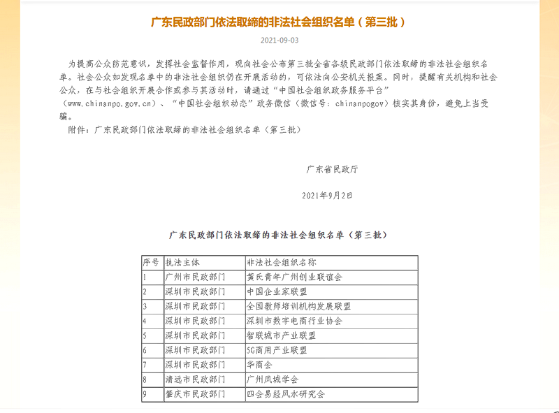 廣東民政部門依法取締的非法社會組織名單(第三批)