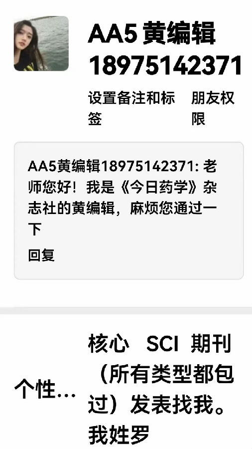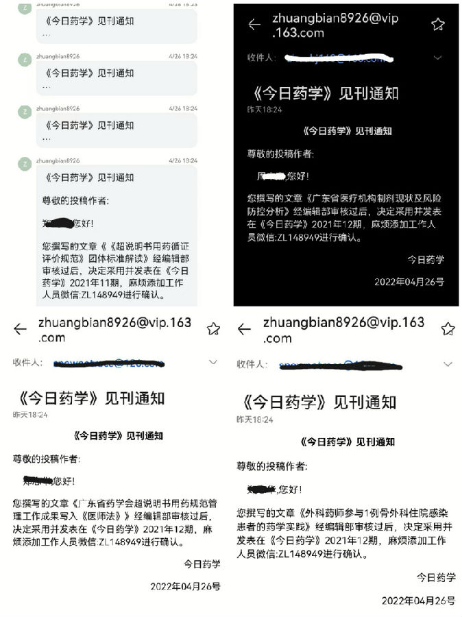 近日,已有多人反映,有人以郵件通知形式(假冒郵箱:zhuangbian8926@vip.163.com)或要求添加微信方式(假冒用微信號(hào):AA5黃編輯18975142371、zzwm1487、ZL148949)冒稱《今日藥學(xué)》雜志編輯部工作人員,聲稱論文已通過(guò)編輯部審核決定采用并發(fā)表,要求作者添加其個(gè)人微信,伺機(jī)套取作者信息、實(shí)施行騙或進(jìn)行其他不法行為。為此,本刊特聲明如下: