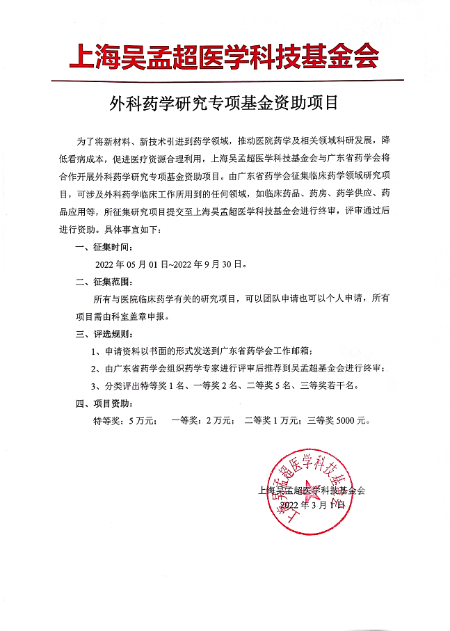 關(guān)于吳孟超基金——廣東省藥學(xué)會(huì)外科藥學(xué)曼陀羅研究專項(xiàng)申報(bào)工作的通知
