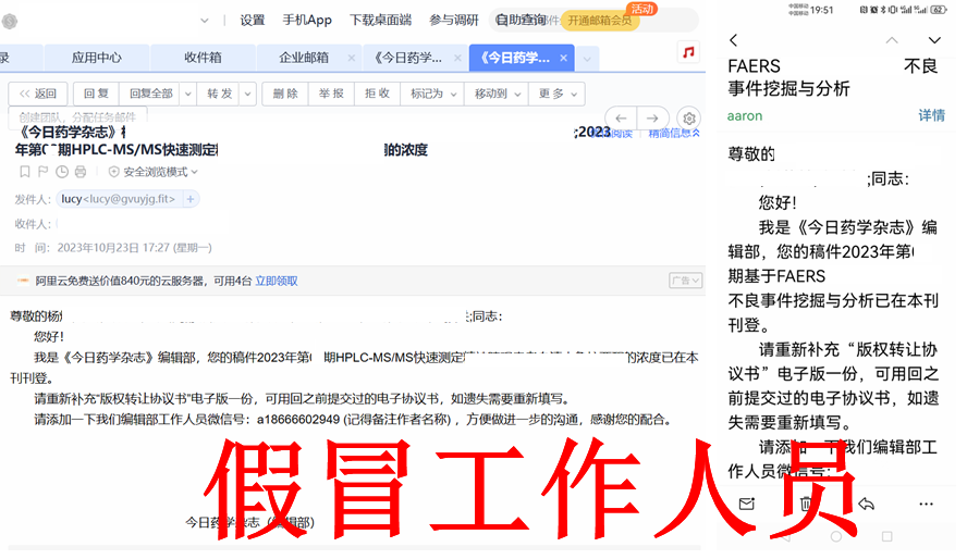 近日,已有多人反映,有人以郵件通知形式(假冒郵箱:lucy@gvuyjg.fit、zhuangbian8926@vip.163.com等)冒稱《今日藥學(xué)》雜志編輯部工作人員,聲稱已刊發(fā)的論文需補(bǔ)充“版權(quán)轉(zhuǎn)讓協(xié)議”等文件,要求作者添加其個(gè)人微信,伺機(jī)套取作者信息、實(shí)施行騙或進(jìn)行其他不法行為。為此,本刊特聲明如下: