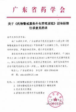 關(guān)于《藥物警戒服務(wù)外包管理規(guī)范》團(tuán)體標(biāo)準(zhǔn)征求意見的函