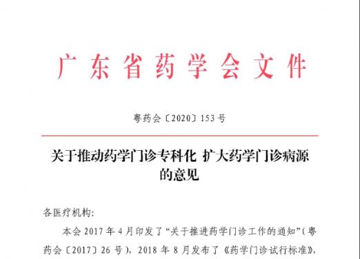 各醫(yī)療機(jī)構(gòu):本會(huì)2017年4月印發(fā)了“關(guān)于推進(jìn)藥學(xué)門診工作的通知”(粵藥會(huì)〔2017〕26號(hào)),2018年8月發(fā)布了《藥學(xué)門診試行標(biāo)準(zhǔn)》,推動(dòng)建立以藥物治療管理(MTM)為模式的藥學(xué)門診后,我省藥學(xué)門診工作得到長足的發(fā)展。目前藥學(xué)門診已進(jìn)入國家的多個(gè)文件,2019年12月中國醫(yī)院協(xié)會(huì)發(fā)布的《醫(yī)療機(jī)構(gòu)藥學(xué)服務(wù)規(guī)范》,...